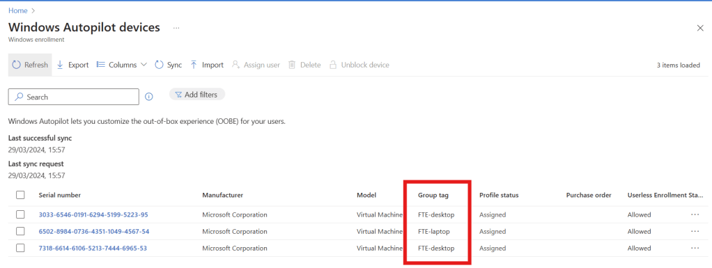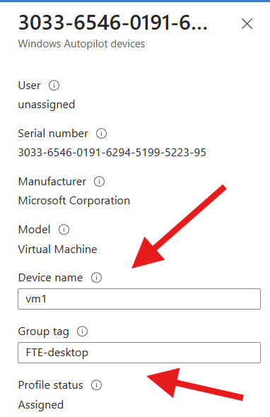 serialNumber: 3033-6546-0191-6294-5199-5223-95 has been assigned the DeviceName: vm1 and grouptag: FTE-desktop