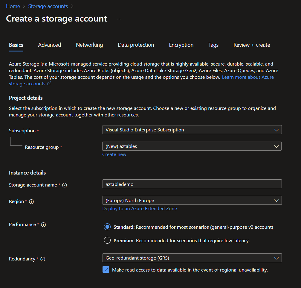 Head to portal.azure.com and search for “storage accounts” and create a new storage account