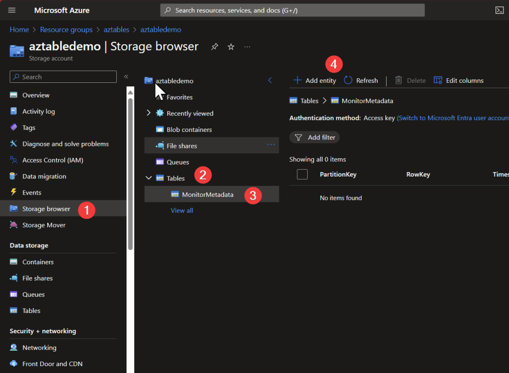 To write to the table, you need to authenticate to it first, and the storage account offers you two ways to do it.