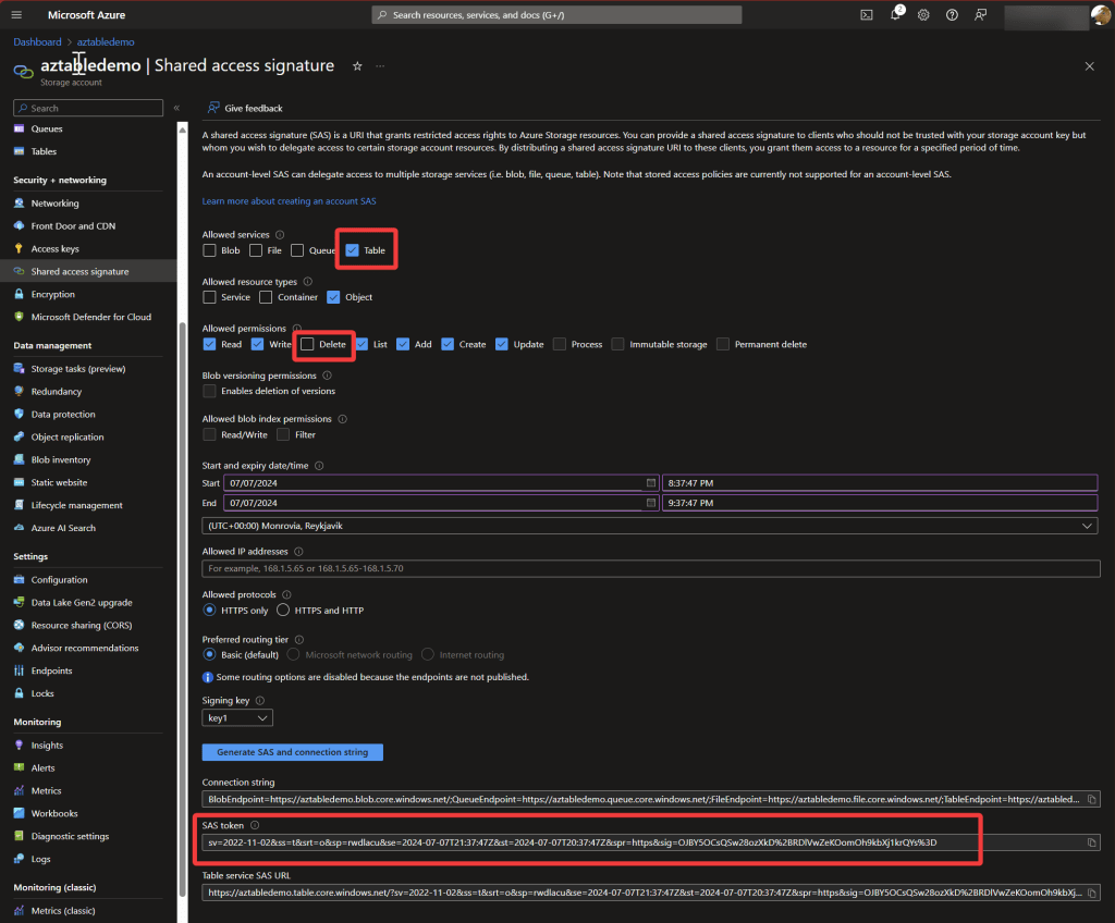 Note the ‘Signing key’, you can go to the ‘access keys’ section in the storage account and rotate the key if you need to invalidate all the SAS that you have made with that signing key.
