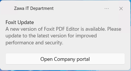 [Windows.UI.Notifications.ToastNotificationManager, Windows.UI.Notifications, ContentType = WindowsRuntime] | Out-Null[Windows.Data.Xml.Dom.XmlDocument, Windows.Data.Xml.Dom.XmlDocument, ContentType = WindowsRuntime] | Out-Null$AppId = "Zawa IT Department"$Title = "Foxit Update"$Message = "A new version of Foxit PDF Editor is available. Please update to the latest version for improved performance and security."$ActionButtonText = "Open Company portal"$ActionButtonUrl = "companyportal:ApplicationId=d096ee12-cc07-4cad-94f8-0c277752fd89"$DurationSeconds = 600$ShowDismissButton = $Falsetry { $Notifier = [Windows.UI.Notifications.ToastNotificationManager]::CreateToastNotifier($AppId) $ToastXml = [Windows.Data.Xml.Dom.XmlDocument]::new() $durationAttr = if ($DurationSeconds -gt 60) { 'duration="long"' } else { 'duration="short"' } $scenarioAttr = if ($DurationSeconds -gt 60) { 'scenario="reminder"' } else { '' } $xmlContent = "<toast $durationAttr $scenarioAttr><visual><binding template='ToastText02' hint-attribution='$AppId'><text id='1'>$Title</text><text id='2'>$Message</text></binding></visual>" $actionsXml = "" if ($ActionButtonText -and $ActionButtonUrl) { $actionsXml += "<action activationType='protocol' arguments='$ActionButtonUrl' content='$ActionButtonText'/>" } if ($ShowDismissButton) { $actionsXml += "<action activationType='system' arguments='dismiss' content='Dismiss'/>" } if ($actionsXml) { $xmlContent += "<actions>$actionsXml</actions>" } $xmlContent += "</toast>" $ToastXml.LoadXml($xmlContent) $Toast = [Windows.UI.Notifications.ToastNotification]::new($ToastXml) $Notifier.Show($Toast) exit 0} catch { Write-Error "Failed: $_" exit 1}