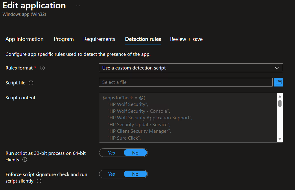 $appsToCheck = @( "HP Wolf Security", "HP Wolf Security - Console", "HP Wolf Security Application Support", "HP Security Update Service", "HP Client Security Manager", "HP Sure Click", "HP Sure Click Security Browser", "HP Sure Sense", "HP Sure Sense Installer", "HP Sure Run", "HP Sure Recover")$registryPaths = @( "HKLM:\SOFTWARE\Microsoft\Windows\CurrentVersion\Uninstall\*", "HKLM:\SOFTWARE\WOW6432Node\Microsoft\Windows\CurrentVersion\Uninstall\*")foreach ($app in $appsToCheck) { foreach ($path in $registryPaths) { $found = Get-ItemProperty $path -ErrorAction SilentlyContinue | Where-Object { $_.DisplayName -like "*$app*" } if ($found) { Write-Output "Found: $($found.DisplayName)" exit 1 # App still installed } }}exit 0 # All apps removed